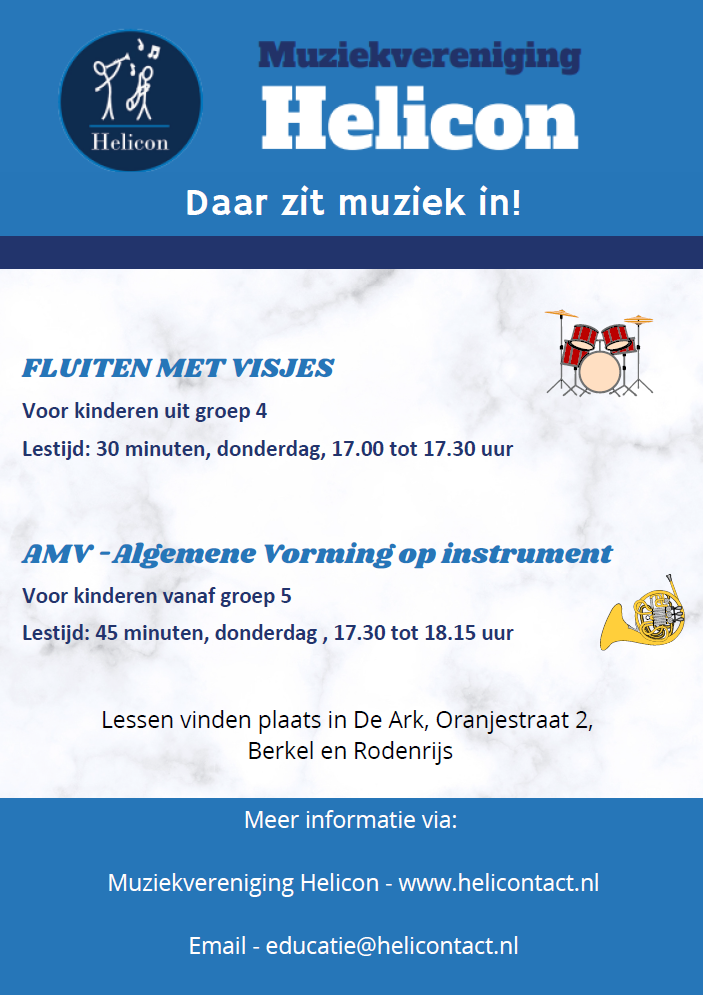 Kosten: lidmaatschap Helicon: €42,- per kwartaal + € 15,- huur instrument per kwartaal als je geen eigen instrument hebt